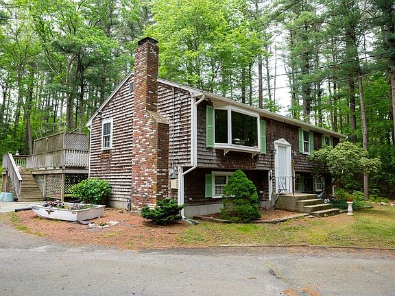 Set down a long driveway, this charming home is nestled in a canopy of trees and mature plantings on 1.9 acre of land with plenty of room to roam. First floor features the kitchen open to dining room and living room with wood-burning fireplace and new bay window. A full updated bath and three generous-sized bedrooms complete this floor with all hardwood flooring. The lower level includes a family room with a gas stove, a large storage/workshop area, laundry area and half bath with access to backyard. Wood deck overlooks private backyard and storage shed. Recent updates include a new front door, roof, bathroom, seven new windows, newer French door to deck and newer septic system (2013). Walk to Marshfield Hills Village with North River Arts Building, Post Office and General Store. Close to all conveniences, Rt. 3 and Greenbush Train to Boston. This home is in the Eames Way elementary school district. Don't miss this opportunity.