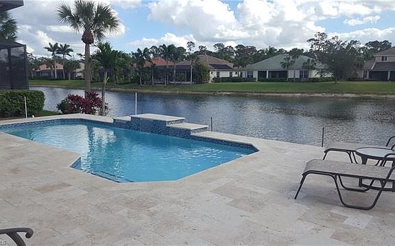 Beautiful Puerto model with southern exposure situated on a premium lake lot with stunning views from your pool deck. Well maintained 3 bedrooms, two baths, 2 car garage pool home on the widest section of the lake. Brand new stainless steel kitchen appliances with a double oven and ultra-quiet dishwasher. Brand new salt water heated pool with Scheer decent waterfall Travertine patio deck, screened covered lanai and a 3 speed programmable energy saving pool pump. The exterior has been freshly painted. Home features a deco tile entry way, crown molding, faux paint tray ceilings, cutouts- archways, high hats, can lights in all rooms, upgraded electrical, 8 foot doors, vertical blinds over the 12 foot sliding door, shelves in the garage and gorgeous lake views from your kitchen and living room. Delasol is a highly desirable gated community with a guard located in the heart of North Naples featuring clubhouse, large pool, spa, tennis courts, fitness center and basketball court. Great location close to schools, shopping, restaurants, business, medical centers, hospitals, parks, recreational facilities and beaches. Brand NEW Pool screen cage will be completed in approximately 3 weeks.
