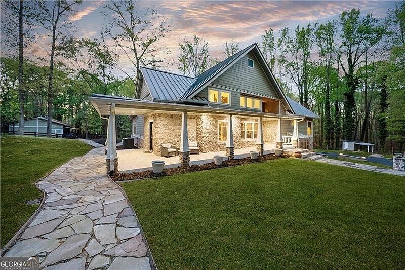 Discover peaceful country living in the heart of Milton with this newer construction craftsman farmhouse, built in 2017, offering just under 3,000 square feet of living space on 8.11 private acres. This charming 3-bedroom, 3-bath home with a wraparound porch is ideally located near shopping, restaurants, and grocery stores, with quick access to Atlanta Hwy 9, GA 400, and top-rated Cambridge High School district. Whether you're seeking a private retreat, mini farm, or equestrian property, this property has it all. The land includes a 24' x 24' three-stall barn with run-out stalls, chicken coop, three fenced grass pastures, a wooded pasture with a large run-in shed, and a previously footed 100' x 50' grass riding arena. As you wind down the paved driveway, you're welcomed by 4-board black wood fencing that frames the picturesque, shady grass pastures-setting the tone as you approach the gated entrance to the home and barn. Tucked away at the rear of the property surrounded by it's pastures and private duck pond, the setting is quiet and serene. As you enter the thoughtfully designed home, you are greeted by a spacious open floor plan enhanced by soaring two-story vaulted ceilings and an airy loft. This layout offers plenty of space for comfortable living, with the added bonus of easy future expansion in the terrace-level garage. Thoughtfully upgraded throughout, the home has 5/8" hardwood and tile flooring, a custom wrought iron staircase with matching balusters, and a 8' double iron front door makes a grand entrance. The open-concept kitchen and living area is the true heart of the home, centered around a 15.5' granite island that's perfect for entertaining or daily life. The kitchen offers ample cabinet space, double ovens, and a large walk-in pantry. Off the main living area, the screened porch includes a stunning stone-clad wood-burning fireplace and porcelain tile floors. A 14' bifold Anderson door opens completely for seamless indoor-outdoor living. Upstairs, a loft overlooking the kitchen makes an ideal spot as a reading nook, movie nights or a home office. The primary suite features a spa-like bathroom with Carrera marble counters, granite sinks and tile flooring, a euro-style double shower, and a crystal chandelier with a hidden ceiling fan. This home was designed with energy efficiency in mind, built with 2x6 exterior walls and high-grade insulation. Anderson tinted windows, ceiling fans in every room, a central vacuum system, two zoned heat pump HVAC units, and new water heater ensure comfort year-round. Well water has been tested and is excellent, though city water is also available. The exterior is low-maintenance Hardiplank and stone with a durable standing seam metal roof. Outdoor living spaces include a 16' x 16' Trex deck, a 36' flagstone patio with walkways, and an additional 12' x 12' Trex deck overlooking your private pond. The property is fenced with 4-board fencing along the road and gated entrance, plus newer perimeter fencing added in 2018. The CUVA agricultural exemption is in place through 2027, offering significant property tax savings. Conveniently located just 1 mile from Atlanta Highway 9, 5 minutes to Bloom Restaurant, 8 minutes to Publix, and within 10-15 minutes of 7 Acre BarnGrill, Scottsdale Farms, Crabapple, Milton, and Halcyon.