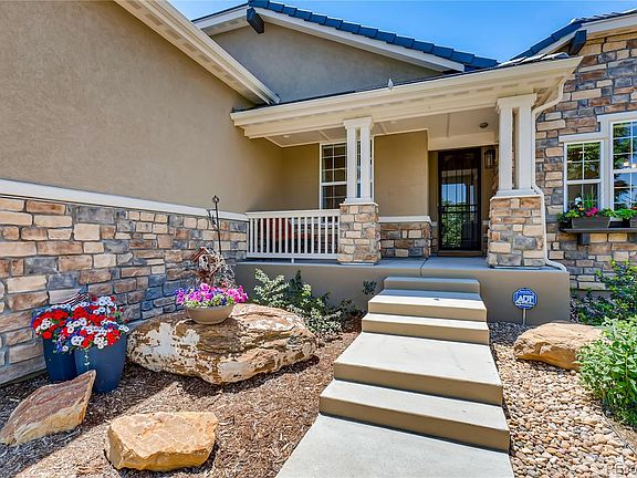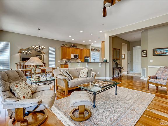 One of a kind Meticulously kept Keystone Model with professionally finished basement in a Tranquil Private Oasis. This home boasts a plethora of upgrades including a Gourmet Kitchen, Pantry Organizer, Extended Cherry Hardwood Flooring,Upgraded lighting throughout, Closet Organizers and 2 Contemporary Murphy Beds. Many inclusions: 2 TVS with wall mounts, all planters with flowers, patio umbrella, upgraded lighting throughout the home, recessed front porch lighting, prewired for surround sound, remote controlled fans, newer sump pump, wet bar with granite and cabinets, 3 large double door basement storage closets with fluorescent lighting and unfinished. Relax in this open floorplan leading out to an incredible outdoor living space including over 750 sq ft concrete patio, 20 retractable commercial grade awning, natural gas fire pit, irrigated backyard berms and gardens and a flagstone walkway around the side of the home. Other outdoor features include window well covers, expansion joints around the home professionally sealed and meticulously maintained mature trees and landscaping. Master bath has European Upgraded shower and separate tub. Granite counters throughout the home and Silhouette and Pirouette Window Treatments. Steam Washer and Dryer included with pedestals in the laundry room with additional cabinets added. 3 large Storage closets in the basement. Possible 3rd bedroom in basement with queen size murphy bed and plenty of storage and closets. Front storm door and fantastic front sitting porch! The Anthem Ranch community and The Aspen Lodge is well regarded for having everything you need, 30,000 sq foot recreation center, with 100+ clubs, tennis, pickle ball and over 48 miles of trails. Enjoy the free summer outdoor concerts, barbeques and the calendar of planned events by a social director!