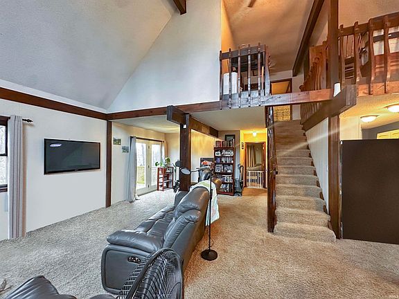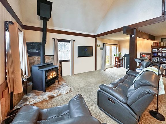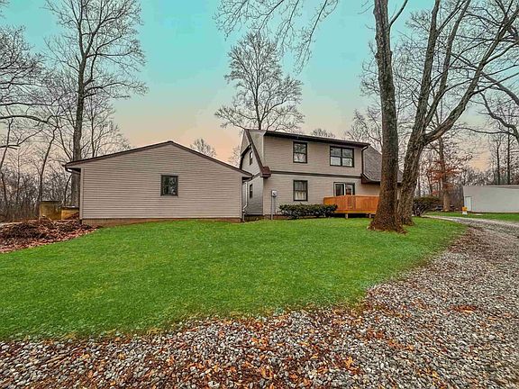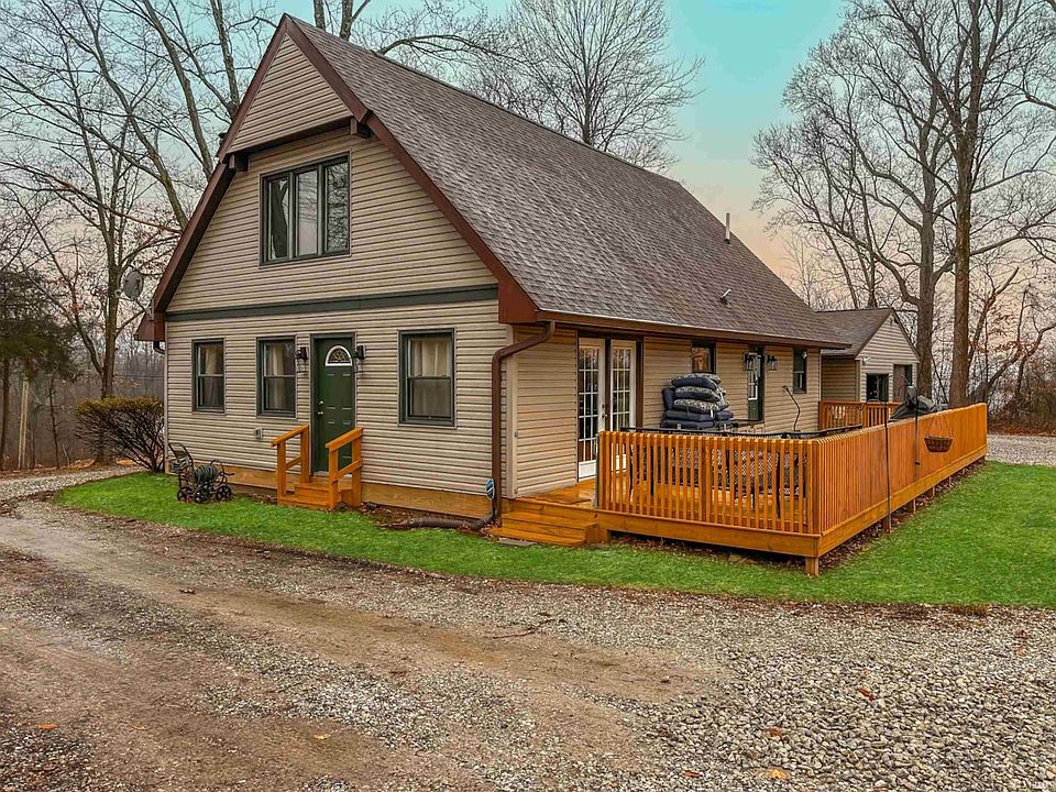 Charming A-Frame Cottage Nestled on 7 peaceful, rural acres, this inviting 3-bedroom, 2-bathroom offers the perfect blend of comfort and nature. With 1,534 sq ft of thoughtfully designed living space, this home is ideal for those seeking a cozy retreat while enjoying modern conveniences. The open-concept living and dining area creates a warm, spacious feel, perfect for both entertaining and relaxing. A new energy-efficient wood stove, installed in 2022, adds charm and warmth, complemented by a heat pump for year-round comfort. Step outside onto the expansive 11x40 back deck, ideal for outdoor dining, relaxation, or simply enjoying the scenic backyard views. The 11x7 front deck provides a welcoming environment, while a circle driveway offers easy access. Roof is only 4 years old. The galley kitchen is complete with Corian countertops and a walk-in pantry, providing plenty of space for culinary creativity. The main level also features a convenient laundry area. The master bedroom boasts a walk-in closet, and the main bath includes a luxurious dual shower head, perfect for unwinding after a long day. For those with a passion for outdoor hobbies, this property offers excellent outbuildings, including a 24x30 detached garage, a 24x36 3-bay pole barn lien to, and a 16x8 chicken coop. Other Features: High-speed internet available through RTC Scenic backyard with regular visits from deer, squirrels, birds, and turkeys Martin House included Private well and septic Detached garage and pole barn offer ample storage or workshop space This charming property combines country living with convenience, located just minutes from I-69 and NSWC Crane. Perfect for anyone seeking a quiet escape with plenty of room to roam!