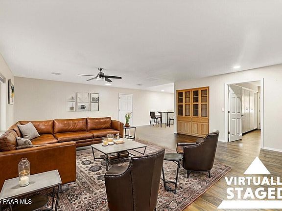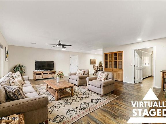Tucked away at the end of a quiet cul-de-sac in the heart of Chino Valley, this one-acre property offers all the amenities of in-town living yet having your own well. An electric gated entry welcomes you onto the property, which is fully fenced and features paved access leading directly to the front door. The home has been updated over the past few years and is complemented by an attached 2-car garage with an extra storage room, as well as a detached 1,140 sq ft garage, workshop, office, storage area, and greenhouse, ideal for hobbies, projects, or storing cars. Step into the enclosed front porch, which serves as a welcoming transition into the home, and enter the spacious great room. Natural light pours in, highlighting the new wood-look laminate flooring that flows throughout the home.