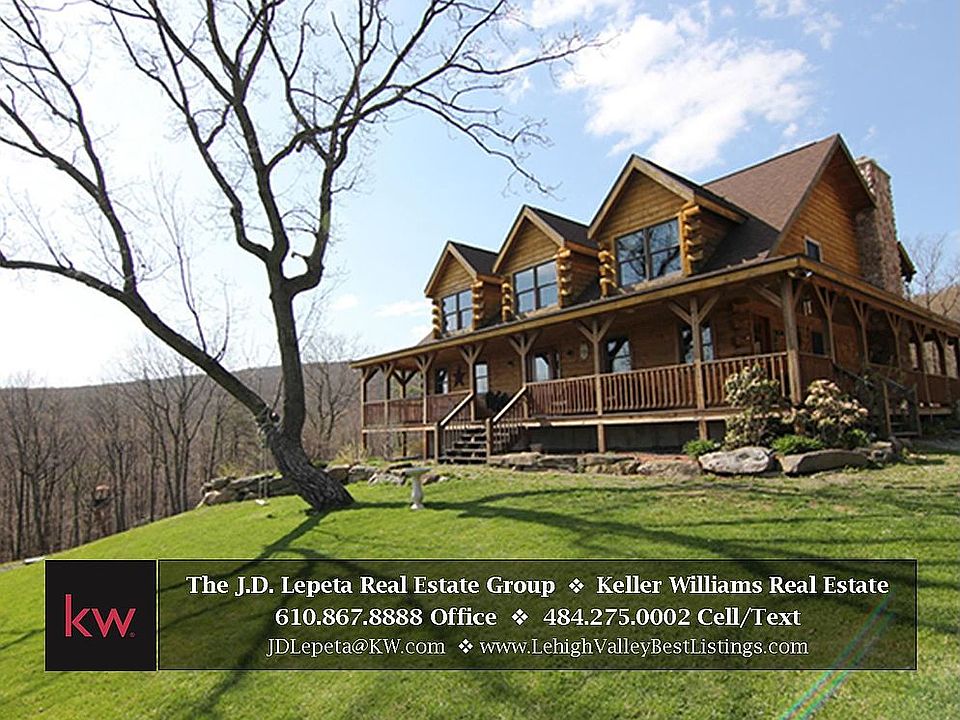 A Fantastic Custom Built Log Home on 34+ acres of Private Wooded LandCall Direct 484.275.0002 The J.D. Lepeta Real Estate Group offers this is truly a one of a kind home. A Custom Built Log Home built on 34plus acres of your very own private wooded land. 360 degrees of fantastic views of the surrounding valley and mountain range. Lush natural tones inside and out are created by log beam ceiling and walls, hardwood flooring, custom wood working, 24 cathedral ceilings, & a magnificent Tiffany Acorn Chandelier in the main foyer entrance. A masterful balance has been achieved between letting the outside light in while still allowing for that private secluded feeling. The main family room has a handmade stone fireplace and chimney. Off the living room through the French doors is a convenient office or study or library. A half bath is located on the 1st floor for guests. Theres also a convenient mud room or side entrance which is used to keep the main entrance and foyer clean. The kitchen was created using antique styling but with modern appliances. 2 dining rooms allow for both formal and casual dining areas. The 2nd floor balcony divides the 3 bedrooms and overlooks both the foyer and family room. On the left are 2 guest bedrooms, both with walk-in closets and a full bathroom. On the right the Master bedroom has its own private master bath with a luxurious tub, side shower and double vanity. The complete wrap around covered porch has recessed lighting and opens up to the rear deck and above ground pool. Enjoy outdoor camping and play area next to your very own pond. An oversized 2 bay, 4 car garage with oversized RV door and 3 large sheds round up this truly one of a kind home. Country living at it finest for you and your family and its only a short drive from major highways providing easy and quick access to and from this Relaxing custom built log home. Call today to schedule your private showing!