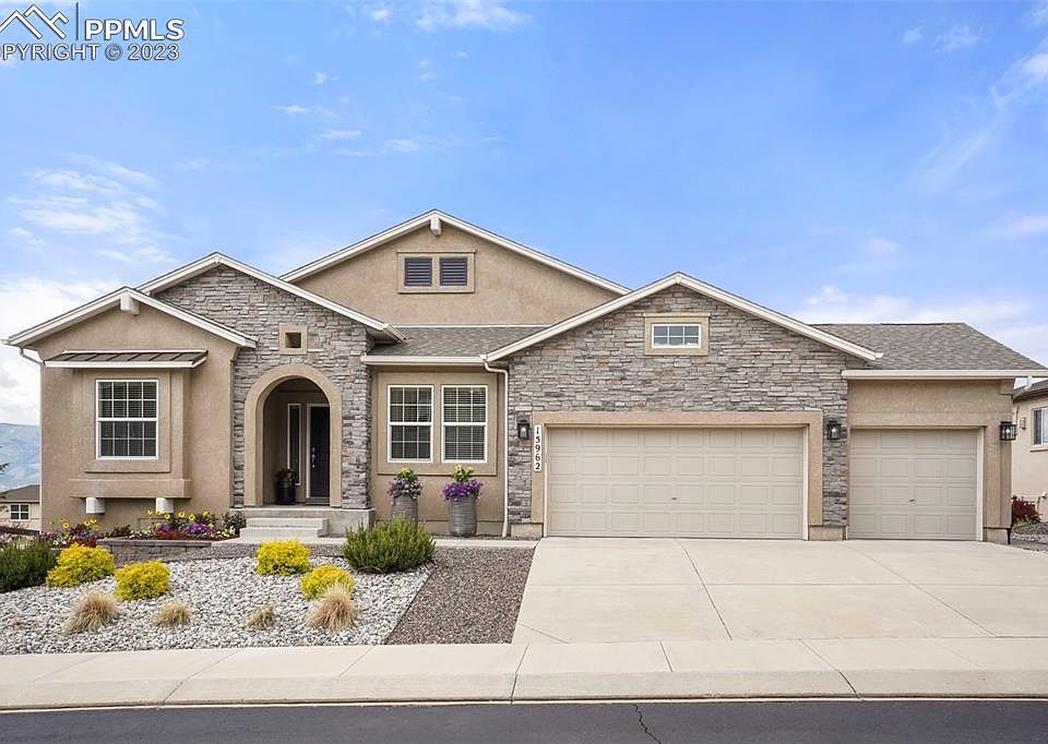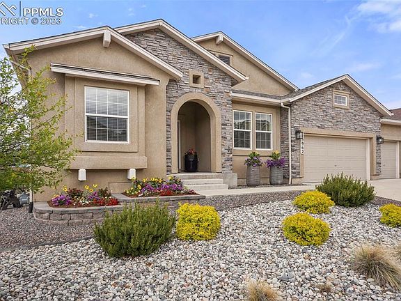 Beautiful walkout ranch with awe-inspiring VIEWS of foothills, Pikes Peak and the Air Force Academy! Smoothly blending executive luxury with Colorado charm, this Classic Homes “Paradise” offers everything you could want in your new home. From the designer accented wood flooring which flows through much of the main level, to the beautifully-appointed Kitchen with island, gas range, granite countertop and gorgeous glass-tile backsplash, every special touch in this home will please the most discerning buyer. High ceilings, large windows and upgraded lighting accentuate the light and bright floor plan. Living Room featuring gas fireplace with stone surround and wood mantle, plus a ceiling fan and VIEWS. Formal Dining Room with wood floor, modern-design light fixture and niche for hutch or buffet, plus a spacious breakfast nook and counter bar providing plenty of eating options. Generous Master Bedroom with VIEWS, walk-in closet and adjoining 5-piece bath featuring oversized shower with bench, double vanity with granite countertop and undermount sinks, water closet with window, and adjoining Laundry Room with utility sink and cabinets. Huge main level Office/Study with French doors, plus bedroom #2 with window seat, and full hall bath complete the main level. Beautiful walkout basement with higher ceilings and multi-use Family Room/Rec Room with gaming area, entertainment area and Wet Bar with absolutely gorgeous high-grade granite. Two additional bedrooms with garden level windows and walk-in closets, full hall bath and huge unfinished storage room complete the basement. Fully-insulated and finished 3-car garage, plus indoor mud room area. Fenced backyard with multiple outdoor entertainment spaces including covered composite deck with solar-lighted stairs, concrete patio and pavestone sitting area, all with VIEWS! Additional upgraded features include wrought-iron spindles, brushed nickel fixtures, central air conditioning, window blinds and more. Truly a stunning home!