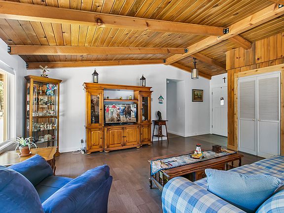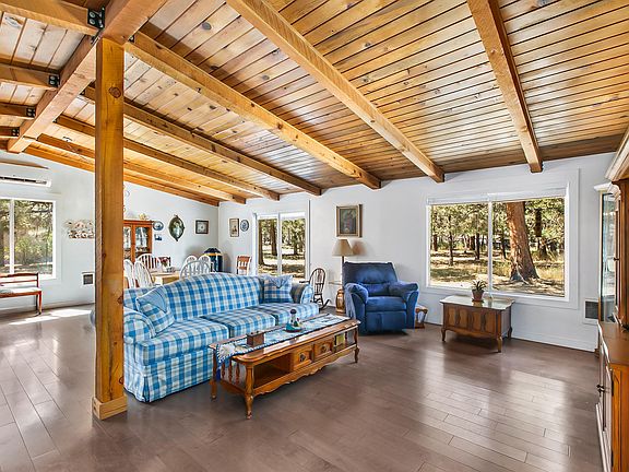 Peaceful, beautiful setting in the Ponderosa Pines! This wonderful single-level home is located in a park like setting on a 1.20 acre lot in a desirable paved cul-de-sac. This home features an updated interior with custom finishes. Enjoy a large open concept great room with Cedar vaulted ceilings and a cedar accent wall. The built in large kitchen-aid side-by-side Refrigerator is included with new range, microwave and dishwasher. 2 pantries for plenty of storage, newer kitchen cabinets. 4 bedroom, 2 bath home with spacious Master bedroom with a sliding glass door which leads to its own deck. Upgrades include a new high-efficiency heat/cool system, a new well and pump, new roof, new circular asphalt driveway, newer septic system, newer flooring and windows fixtures, tile, toilets. Plenty of room for RV Storage and space to add a shop.