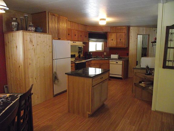 A very well maintained home and property that sits on1.22 aces nestled under many mature ponderosa. With a 1440 s.f. double wide. 3 bd 2 ba. plus 576 s.f. shop, wood shed, hay storage and 2 other sheds approx. 200 s.f. with awning on both sides for horses. Also metal R.V. building 3-sided. Approximately 1/2 of property is graveled, all kinds of area to park anything. This home is located on a quiet short dead end road. Owner Carry - $176,000