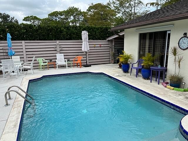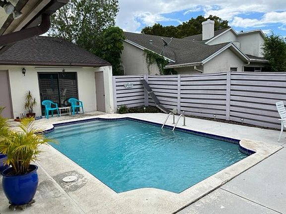 Wow - what a unique property! No HOA! Brand new roof Aug. 2022!Enter the patio area with your own private pool! Cute 2/2 villa with newer carpet in bedrooms, and tile in kitchen and liv areas.Full size washer and dryer! Located centrally in Wellington, close to everything.