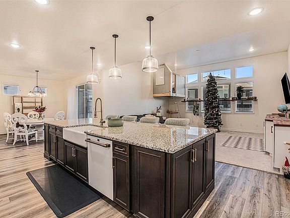 2021 build by local award winning builder Lokal Homes! Over $100,000 of custom upgrades!!! Not your average builder home! Welcome to your custom oasis at The Estates at Buffalo Run Golf Course. Ranch style living to the nines! Gorgeous custom front door, brand new custom Cafe appliances, custom pantry, custom laundry wall, cabinetry and shelving/rod added, cased in windows, custom storage at entry from garage, exterior outlet added for holiday lights connected to interior switch for easy control, garage service door out to backyard, Spacious open floor plan. The main floor features gleaming hardwood floors. 12 ft ceilings in the great room with custom cabinetry and wood countertop matching the kitchen great for storing toys away! Gourmet kitchen, INDUCTION stove (boiling water in 90 seconds!!) and formal dining room with sliding glass doors. The kitchen features an oversized island with stunning dual toned luxury soft close cabinetry, all new door hardware, double ovens, granite countertops, tile backsplash, pot filler, CUSTOM pantry!! 2 bedrooms with full jack and jill bathroom at the front of the home. Home office currently being used as the 4th bedroom. Primary suite at the back of the home. 5 piece spa bathroom is a dream come true!! Tile flooring, dual vanity, walk-in closet, soaking tub and stunning walk-in shower with bench and tile detail!! Full unfinished basement for you to add more bedrooms, movie theater, home gym, storage room and more!!! Extended Covered Patio with FLAT BACKYARD OASIS!! Fire pit, brand new turf installed, garden beds! Whole house fan and whole house humidifer. Basement is pre plumbed for a wet bar and a bathroom! Extra electrical panel tied in to the basement. Fabulous location 15 minutes to Denver International Airport, 20 minutes to Downtown Denver, and minutes to I-70 for the weekend mountain adventures!! Built for the Colorado Lifestyle!! Enjoy the Estates at Buffalo Run, a community featuring exclusively ranch floor plans!!