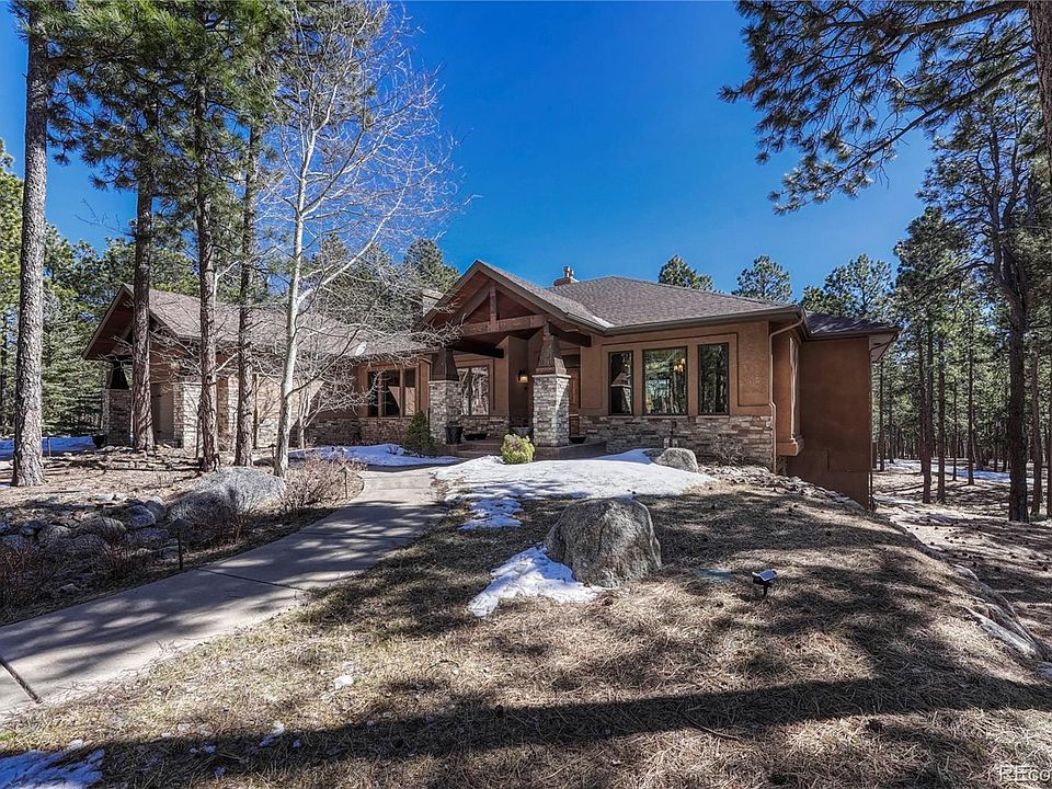 An Exquisite Colorado style custom home is available in A prestigious, treed and gated community* High Forest Ranch*. With 3 acres, this beautiful Lot provides you with all the peace and privacy you would expect from Living on this luxury cul-de-sac. This home Speaks to Colorado with well appointed Knotty Alder Vaulted ceilings, Trim, grand cabinetry and solid doors throughout. The Great Room frames a beautiful natural forest view allowing You enjoy the serenity while sitting at the Stone fireplace. Here you can enjoy A beautiful snowy day, or a doe and her fawn bedded down for a nap. The massive gourmet kitchen will amaze you with it's abundance of Custom Cabinetry, Extensive Upgraded Granite countertops, Double Ovens and Prep Sink and separate Coffee Bar in the Butler's pantry. Gather in the formal dining room or eat in the walkout nook. It's always lovely to eat out on your back covered deck and feel the great outdoors. You will enjoy working in your spacious office that gazes through your mature pines. Retiring to your Suite is a true delight as this room is massive with room for all your furniture and extra large bed. Snuggle in with your Fireplace Or slip into your spas jetted tub for luxuriating bubble bath. Your custom closet is an exquisite delight. For a good movie or ball game, head down to your walk out Basement with a Game room, wet bar and Plenty of open space. From there walk out to the back patio where you will have space for your hot tub and A flagstone gathering area and more. To the side are some raised bed gardens. The basement has 3 good sized bedrooms and 2 finished bathrooms. Hidden treasures include: oversized 3 car garage With high ceilings and elite epoxy flooring, voice-activated window coverings, well Filtration ultraviolet system,10K in landscaping lighting, Central vac, Radon mitigation reading every 10 minutes, bidet toilets, house humidifier, Clubhouse, 2 fishing ponds, acres of green space and hiking trails, Hwy 83 And so much more.