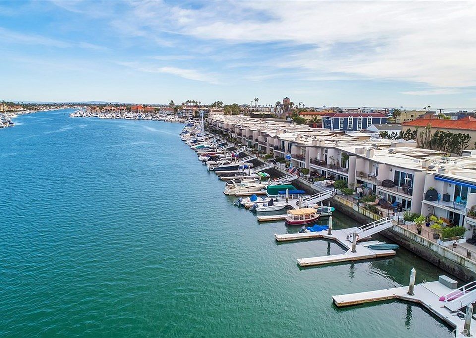 BEST PRICED WATERFRONT HOME IN HB! Amazing sunrise and sunset views of the bay & mountains from this sun-soaked second floor unit located in an exclusive gated community. Spacious 3 bed, 2 bath, 1569 sq ft home includes a boat slip which can accommodate up to a 30â vessel. Imagine having access to your boat right in front of your condo. The custom dinghy dock is an extension that increases your access to the harbor. The open style living room has a dramatic floor-to-ceiling gas fireplace that creates a cozy feeling while the mirrored walls in the dining area double the spectacular view. Wall to wall windows open up onto a large tiled balcony overlooking the marina & bay. The retractable awning and outdoor heater create a year round outdoor living space perfect for entertaining. The gourmet Chefâs kitchen has granite countertops, upgraded appliances, custom cabinets & large pantry with pull-out shelves. Amenities include a lighted laundry closet which accommodates a full-sized washer and dryer, bamboo hardwood floors, newer carpet, window coverings & forced air heating. The over-sized master suite opens onto a private tiled balcony. The large walk-in closet has custom built-ins and the full bath is tiled with double sinks. There are two large light-filled rooms (one has a bay view!) with full-length mirrored wardrobe doors and over-sized closets. The unit includes three designated parking spaces, 1 car garage, a covered carport parking space and parking in front of the garage.