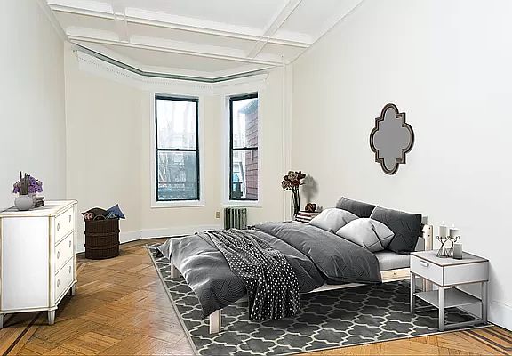 Inside the apartment, you'll find gorgeous bay windows in the front and back of the house that bring plenty of natural light into the living space. Coffered ceilings, original wood floors with inlay details, and a recently updated suite of kitchen and bathroom fixtures and finishes make for a move-in-ready situation.