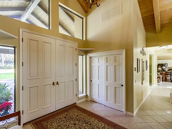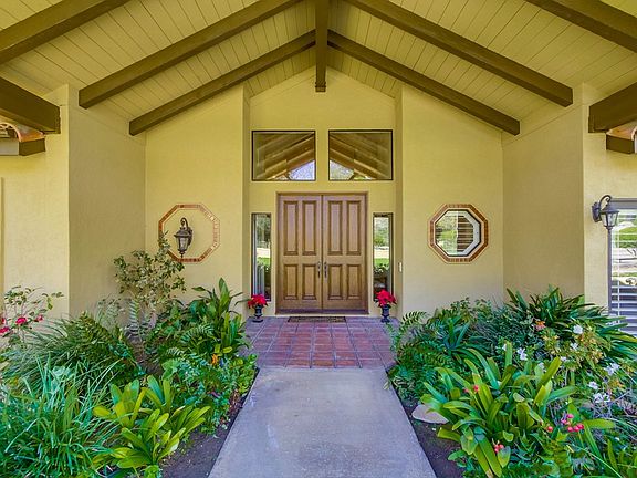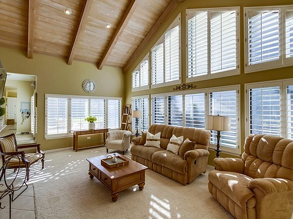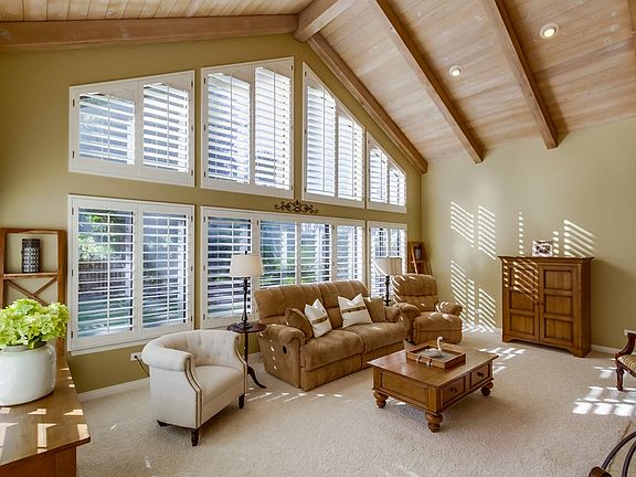 Exquisite home in Poway, CA has it all! Beautiful single level 4 bed, 3.5 bath 3,585 sq. ft. home on a private, corner lot near convenient shopping and an excellent school. This home features designer paint inside and out, a bright eat-in kitchen, gorgeous white cabinetry and a huge island. Extra large dining room, separate living room and laundry room. It boasts a spacious vaulted family room ceiling with wooden beams, plantation shutters and crown moulding for elegance. There is direct access to its 3 car garage off the kitchen with a extra built-in workspace nearby. The master bedroom and guest room both have en-suites and two bedrooms share a jack-n-jill bath. Access to highly acclaimed Poway Unified School District! Painted Rock Elementary School is about 1 mile away. Don't miss this opportunity!