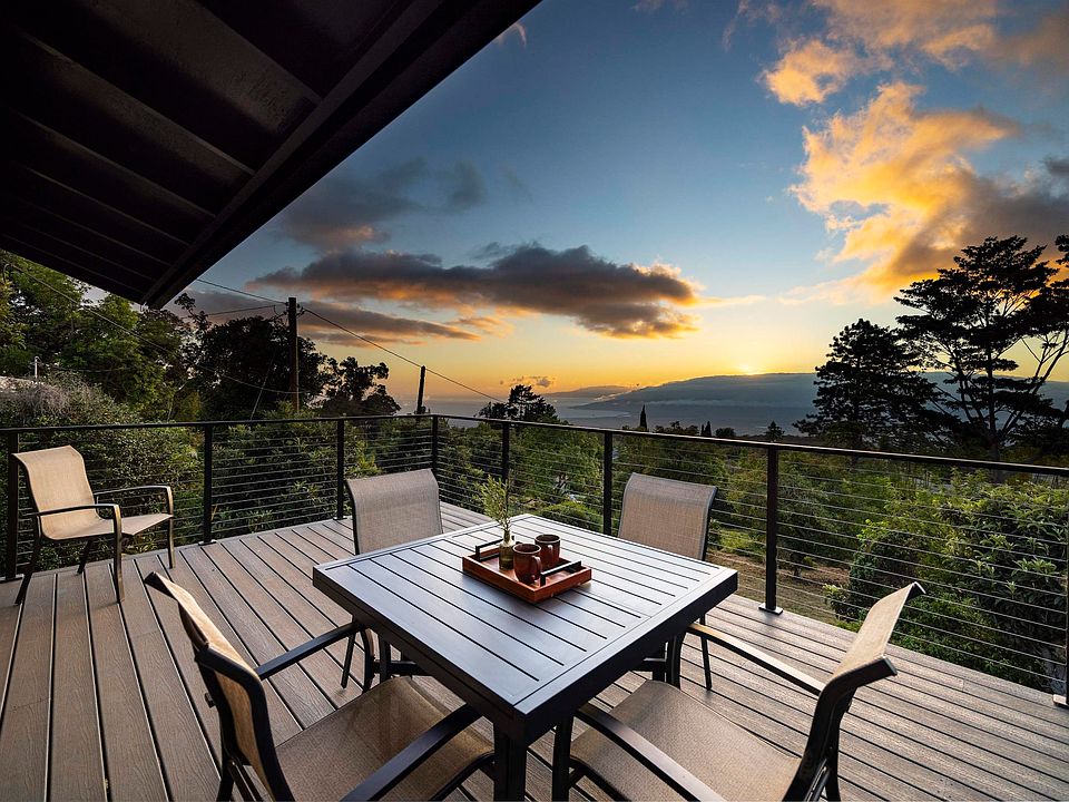 Renovated modern retreat in the heart of Kula. This beautifully updated home on ¾ of an acre offers stunning bi-coastal and year-round sunset views. The open-concept layout flows seamlessly to an expansive lanai—perfect for entertaining or quiet evenings overlooking the horizon. Features include net-metered photovoltaic, catchment water system, and elegant finishes throughout. Enjoy ample outdoor space for farming or gardening, with mature avocado trees already thriving. Private, peaceful, and move-in ready—this is Upcountry living at its best.