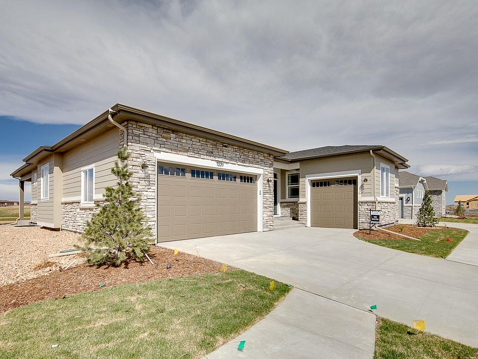 Brand New Home! Beautiful Walter ranch plan situated on large cul-de-sac home site. Beautiful contemporary finishes throughout including unique stone gray cabinets. Kitchen includes an expansive island, quartz countertops, upgraded stainless appliances including double ovens, 5-burner gas cooktop and refrigerator. Extensive 7 1/2" laminate plank flooring throughout entire living area, upgraded tile, lighting, fixtures and paint. Fireplace with tile surround in the large great room which features airy 12' ceiling, 5-piece master bath, and study which adds to the luxury and livability of this home. Master privately situated away from other bedrooms. Enjoy outdoor living from the covered patio. Quiet golf course community with easy access to I-76, E470 and DIA. Pictures are of similar model home.