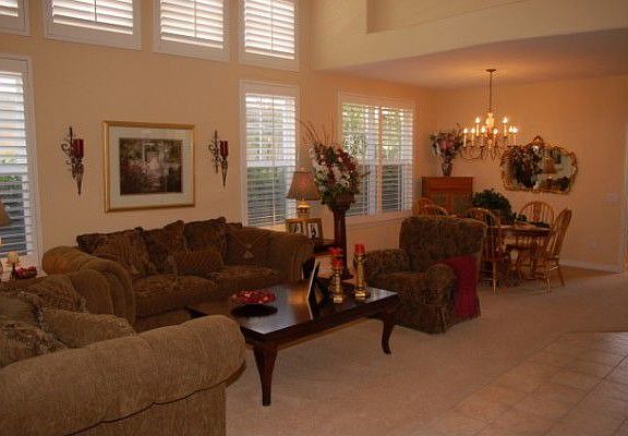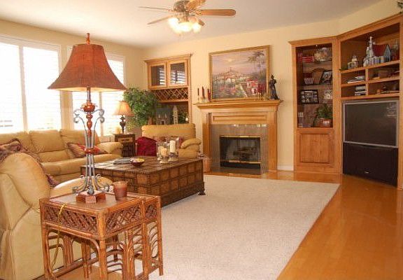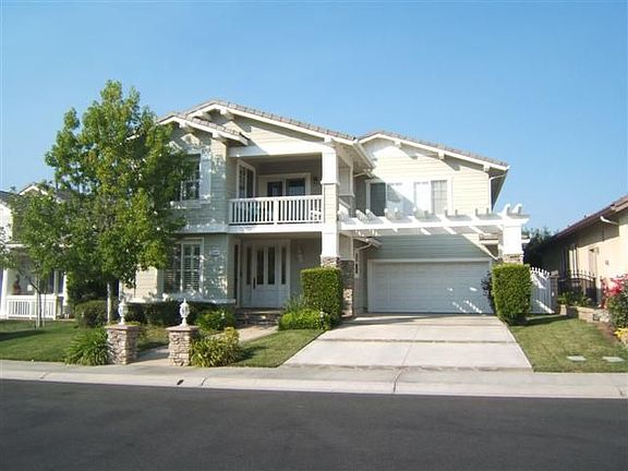 This elegant home is located in the Tapestry development of Rancho Conejo in Newbury Park. This private guard-gated community is located near Amgen and provides convenient access to the 101 freeway. The development includes community pools and spas and located nearby is the 13 acre Rancho Conejo Playfield with softball fields, tennis courts, basketball court, play areas and picnic areas. Built by Shappell, the Palomino Plan is reminiscent of California Monterey architecture, with a covered porte-cochere, upper balconies, wide covered front entry, stone finished steps and lush landscaping. The exterior is finished with soft sage colored clapboard, stone pilasters at the entry steps and porch, white trim grey tiled roof. The front door has Art Deco styling with glass inset and side lights.From the tiled entry, the volume living room ceiling looks up to the curved balustrade atElegant travertine tile is laid on the diagonal throughout the downstairs. The living room features a fireplace with a stone surround and wood mantle, flanked by two large windows and is open to the formal dining room and the family room. The openness of this floor plan brings the outside in with plentiful windows and light. The open and spacious center-island kitchen is beautifully finished with slab granite, custom tile and stone mosaic backsplash and bar counter. There is also an adjacent breakfast room.The master bedroom overlooks the back yard and patio and includes a light and open bath with a deep soaking tub, dual sinks, separate shower and private water closet. The three secondary bathrooms share an upstairs hall bath. There is a loft at the top of the stairs, perfect as an upstairs den or study space.The back yard is finished with pavers, a motorized retractable awning perfect for outdoor entertaining, and a full length planter. The vine covered back wall creates a lush appearance and there is a grassy area and ample side yard space.