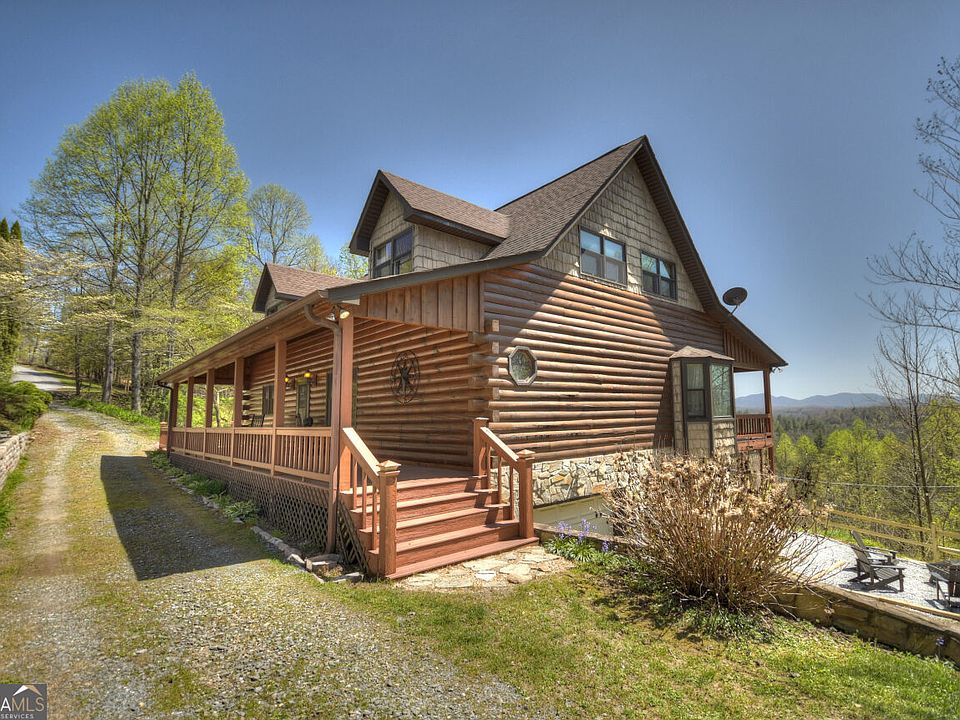 Here is your opportunity to own a slice of the mountain and let it pay for itself. Paradise Ridge, as the home is named, is just that-paradise. The place you don't want to leave. Boasting a proven rental history, this Lodge-style Mountain Home offers the epitome of mountain living. Its grandeur unfolds with a majestic great room adorned by a soaring cathedral ceiling, wood-burning rock fireplace, and French doors opening to porch with breathtaking mountain vistas. The kitchen boasts granite counters, cozy breakfast nook, built-in desk, and a bar for additional seating and counter space. A separate dining room sets the stage for memorable gatherings. One of the luxurious en suite King bedrooms is on the main floor with French doors opening to a spacious porch and Mountain View. Completing the main level are a powder room and laundry room. Ascend the staircase to the open loft with sleeper sofa, and 2 generously-sized bedrooms and full bath. The terrace level unveils another en suite King bedroom, where French doors lead to a tile patio, offering serene views and easy access to the 8 person hot tub. This level also features a cozy den with gas log fireplace, game room, and ample storage space. The interior of this home is cozy and decorated in a modern mountain style and comes completely furnished. Outdoor living is important in the mountains and this home features a wrap-around porch. The large back porch features dining areas and sitting areas and is equipped with a grill. The lower covered porch includes a gas fire pit, porch swing and the hot tub. The backyard features a wood-burning fire pit adorned with lights and seating facing spectacular views. The home features a one-car garage, large gravel parking area and pull-through driveway for ample parking. Despite being a successful short term rental, the home has been lovingly maintained by the owner. HVAC completely replaced in 2020. A wonderful place to either call home or use as a completely turn-key investment,