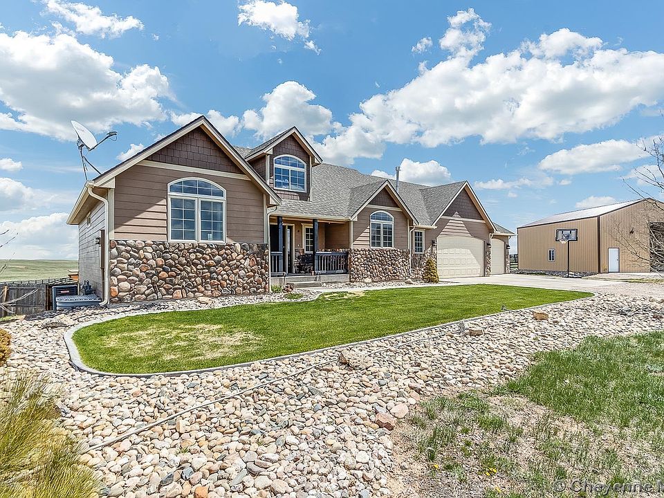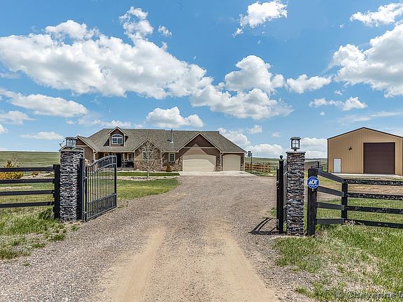 This magnificent ranch style home captures your attention from the minute you approach with a beautiful gated entry and split rail fencing around the property. While still close to the amenities of town, the privacy provided by this lot is second to none at the end of a cul-de-sac and backing to 663 acres of community open space to the North, and a combined 1,120 acres of ranch land to the East.. The backyard is an entertainer's paradise featuring lush grass, relaxing water feature, pergola, fire pit and patio accessible from the walkout basement or the deck. Quality finishes throughout the home, a wet bar in the basement, and luxurious spa like bathroom in the basement with heated floors make this a home you won't want to miss! The 30x40 outbuilding with concrete floor and oversized overhead door has room to protect all of your toys throughout the year. Home has a transfer switch for generator hookup, and water for livestock near the 24 x 15 loafing shed.