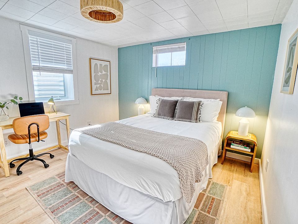 If you are facing the house, the room is in the upper level, facing the front yard. **Room 2** This private bedroom is a perfect blend of comfort and functionality. Featuring a cozy queen bed, a chic workspace, and a spacious closet, it's designed to meet your relaxation and productivity needs. Whether you're unwinding after a day of adventures or catching up on work, this room provides everything you need to feel right at home. You'll also enjoy access to thoughtfully designed shared spaces, including: -Fully Equipped Kitchen: Prepare meals with ease using high-quality appliances and all the essentials. -Comfortable Living Room: Relax in the spacious shared living room, complete with plush seating and a Smart TV for your entertainment. -Two Shared Bathrooms: Clean, bright bathrooms with spacious tubs and showers for your comfort. -Laundry Facilities: On-site washer and dryer to make your extended stay hassle-free. -High-Speed Wi-Fi: Stay connected for work or entertainment. 3 to 6 months. Month to month. MAINTENANCE: The property manager handles all maintenance. Please report any issues promptly for a quick resolution. HOUSE RULES: 1. Respect your fellow housemates and their belongings. This includes keeping common areas clean and tidy, not disturbing others with loud noises or late-night activities, and respecting each person's right to privacy. 2. Follow the rules regarding the use of shared facilities, such as the kitchen, laundry room, and common areas. This includes washing dishes after use, not leaving dirty laundry lying around, and not monopolizing shared facilities for extended periods of time. 3. Please store food on your designated shelf, marked with your color. Any items left outside your shelf or on the countertop will be moved to a box in the garage during weekly cleaning. Check the box for misplaced items. Unclaimed items left for over a week will be discarded. 4. For everyone's comfort, please keep personal belongings (clothing, underwear, etc.) inside your bedroom. Any items left in the common areas will be moved to a box in the garage during weekly cleaning. Check the box for misplaced items. Unclaimed items left for over a week will be discarded. 5. Report any maintenance or repair issues to the host in a timely manner. This helps to ensure that any problems are addressed quickly and efficiently. 6. No illegal activities or substances are allowed on the premises. 7. Smoking is not allowed inside the house. 8. No parties or events are allowed in the house. Please respect our home and neighbors by keeping noise to a minimum. 9. Keep the noise level down after 9 PM to respect your fellow housemates' need for rest and relaxation. 10. To respect the privacy of other guests, visitors are not allowed. 11. If you plan to be away for an extended period of time, please let the host know. 12. Please treat the shared house as if it were your own home and respect the space and belongings of others.