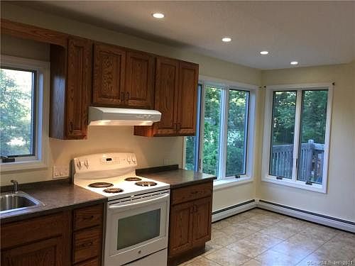 Home was completely re-built in 2014. Unit is 2nd and 3rd floors of a Colonial style single family home. From a covered entry, stairs lead up to the main living area, soaring cathedral ceilings and ample windows in the large eat-in kitchen, 2 screened slider doors walk-out to wrap around deck, chandelier over the dining area, bright and open floor plan with vaulted ceilings, skylights, solid oak hardwood flooring throughout, tile kitchen and baths, corian bath vanity tops, two ceiling fans, 1800 sqft 3 bedroom, 2 1/2 baths, laundry room with washer/dryer, third floor Huge Master with on-suite, lighted closet and built-in wall unit air conditioning. Ample storage on 3rd floor. Some 1st fl locked storage available. Private gravel driveway can easily accommodate 4 vehicles off street. Available January 4, turn key. security deposit required with Minimum 1 year lease. Renters insurance required. Tenant responsible for propane heat, hot water, electric, cable tv, internet and snow removal. Landlord maintains building and maintains homeowners insurance, pays water/sewer bill, trash, and maintains lawn. Walk to Lake Pocotopaug and Sears Park. Five minutes to Stop & Shop at Route 66. Pets considered on case by case basis. Spacious private back yard.