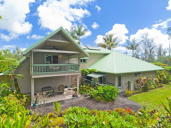 As you wind up the lush, palm-lined driveway, you'll instantly know—this is no ordinary home. Nestled on a private 3-acre tropical estate, this stunning retreat is surrounded by mature fruit trees, vibrant tropical foliage, and fragrant island blooms. Tucked away on a paved road with easy access to Highway 11, you're just a quick drive to Hilo, Volcano National Park, and the stunning coastline—yet a world away in your own private paradise.