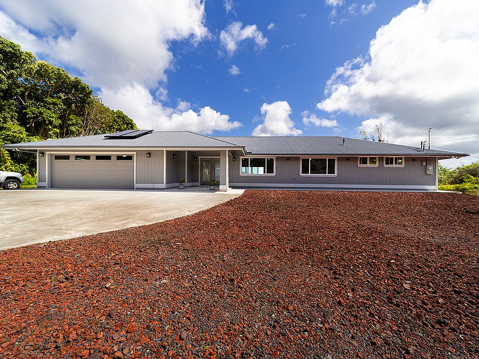 Nestled in the lush surroundings of Hawaiian Acres, this stunning 3-bedroom, 2-bath home on paved Moho Rd offers the perfect blend of modern comfort and serene island living. Built in 2022 and set on 3 private acres, this home boasts over 2,000 square feet of living space with an open floor plan and vaulted ceilings, creating a bright and airy atmosphere. The expansive great room flows seamlessly into the custom-designed kitchen, featuring quartz countertops, white farm house sink, double armed faucets, custom cabinetry, and a spacious peninsula with seating for four—perfect for entertaining. Just off the kitchen, a dedicated laundry room and pantry add convenience.