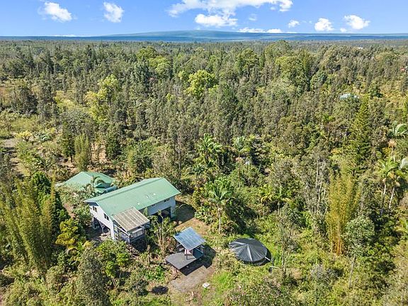 Situated on 3 fully fenced and landscaped acres in cool Mountain View is this 2 story, 3 bedroom 2 bath home with ocean views. Built in 2005, this 1,217 sq ft home has been recently updated. Improvements include new paint throughout, brand new vinyl flooring, and new granite countertops in the kitchen. Both bathrooms have been updated with new ceramic tile in the showers, new vanities, paint and all new fixtures. The natural finish wood vaulted ceilings give the great room a lovely open feeling. There is a sliding door from the dining area that opens to a covered lanai with a beautiful ocean view. Built 12 feet up on post and pier, the space under this home has many possibilities. Enclose the area for additional living space, a workshop, game room. Use your imagination to decide how to utilize this great covered area. There is an approximately 700 sq ft, detached garage with double garage doors, currently set up as living space. There are a toilet and sink in this space along with an outdoor shower behind the garage. A covered breezeway separates this garage space from the main home. Together, the garage and home boast over 2,000 sq ft under roof, not including the space under the home. There is a detached, partially covered lanai that was previously a deck for an above ground pool. There is even an underground electrical conduit that was used to run the pool pump. The 3 acres have been fully fenced all the way around the 150' wide by 871' long lot. The Seller has spent the last 6 years hand clearing and landscaping the property. There are many areas that are cleared down to the rolling, natural pahoehoe lava terrain. There are small rock walls surrounding some of the plantings including many varieties of rhododendron, bromeliads, hibiscus, angel's trumpet, bamboo, heliconia, citrus, avocado, podocarpus, ti, eucalyptus, variegated lauhala, a variety of orchids planted in the trees and many more. Truly a tropical oasis.