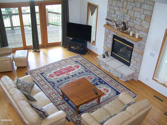 This roomy 1 1/2 story waterfront home has 4 bedrooms and 3 baths. The main level kitchen, DR and LR area includes a stone gas log fireplace, open stairway and floor to ceiling windows with patio doors facing the water. Hardwood flooring, 2 bedrooms and a bath are also on this level. The lower level features stained concrete flooring, kitchenette with refrigerator and sink, plus a spacious living area that has sliding doors that lead out to a deck and down to a flagstone patio and natural limestone seawall. A must see!!!