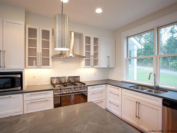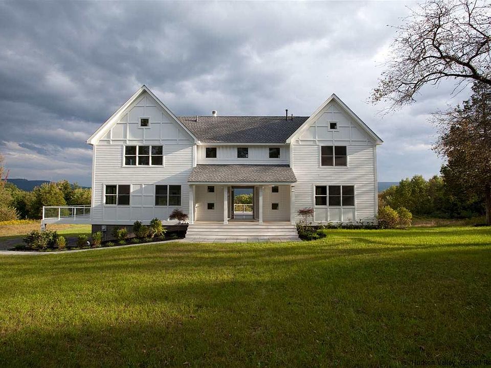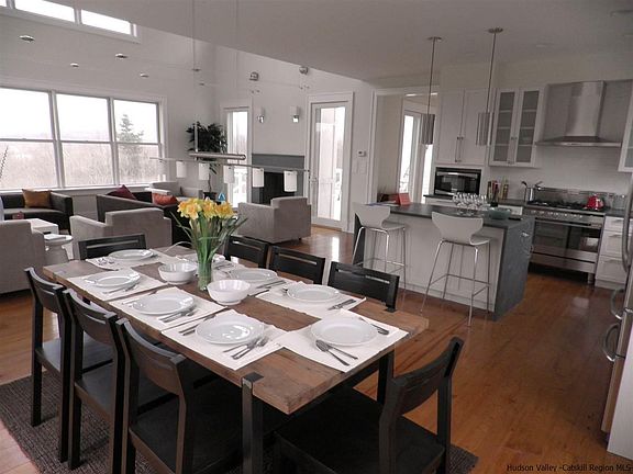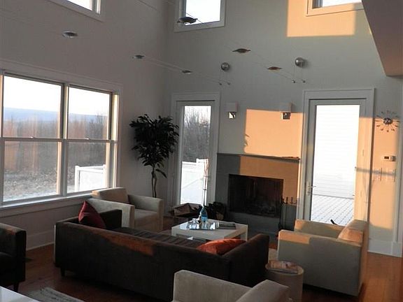 This "Farmhouse Modern" home balances a nostalgia for calmer, simpler forms and spaces. Innovative and unique, it combines classic "American Farmhouse" with cutting edge "Urban Style." A stunningly large living-dining and kitchen area with ceiling soaring to 28 feet, a large sitting and conversation area with a fire place at one end and TV at the other. The easterly portion of the living room opens onto a large deck and has sweeping 180 degree views of the Shawangunk Mountain range. The open dining room at the northwest corner is adjacent to the large gourmet kitchen. The ceiling is lowered for intimacy while the dining area opens on to its own private dining deck that also has views of the Rondout golf course and the "Gunks," as they are referred to. At the south end of the home is an immense private master suite with oversized walk-in closets and spa bath area with separate glass shower area and private toilet room. This Master bedroom also has views of the "Gunks" and the wooded areas to the southeast. This amazingly scenic location overlooks the 18 hole championship Rondout Golf Club to the West and Shawangunk Mountain range to the East. The 2nd floor contains 2 bedrooms and a "Jack & Jill" bathroom. It also includes an expansive mezzanine that overlooks the living room below and contains even more spectacular views to the east and west. It can function as an ideal play/study area or an art studio or could be altered into two additional bedrooms. The ground level floor contains a large private office or "nanny/granny" use includes full bath. There is also a 700 square foot entertainment/play room with sliding glass doors that open onto a very private paved patio with lawn and meadow beyond. This house defies the ordinary with a focus on green design that makes an efficient and beautiful year round, summer or weekend residence. Engineered walls, floors, and roof for energy savings. Acoustical insulation blankets in all bathroom walls & master suite ceiling and floor. The surrounding areas provide a setting of immense beauty rich in both natural and cultural activities. Conveniently located 1/2 hour or less to New Paltz, Kingston, High Falls and Rosendale. 1 hour to Albany and 2 hours to NYC.
