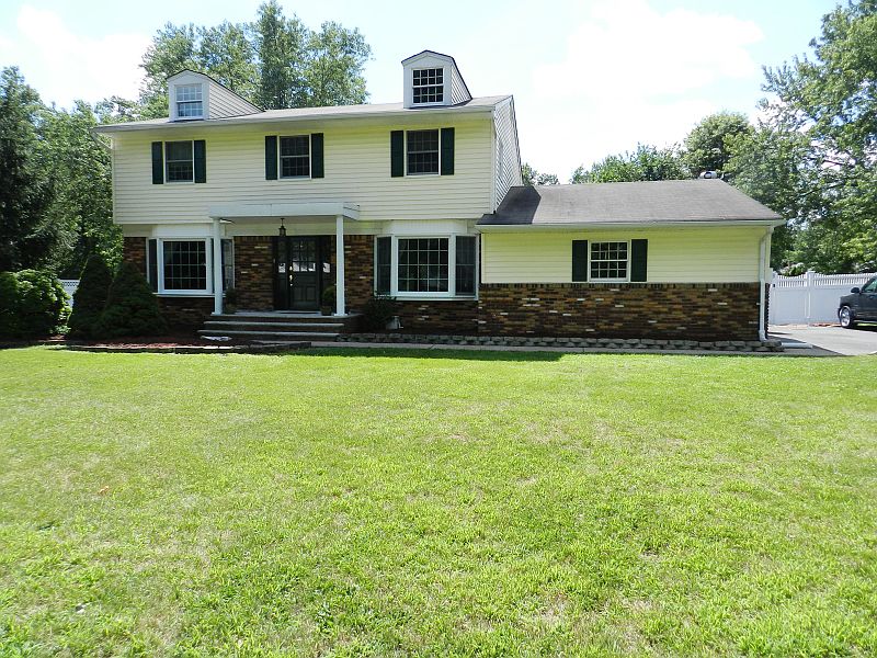 Spacious & bright Colonial! LR w/bow window & hardwood floor. Formal DR w/HW floor, bow window & chair rail. Eat-In Kitchen w/built-in wine rack opens to the Family Room with stone accent wall, fireplace and sliders to the Patio for a perfect indoor/outdoor flow. Convenient First Floor Powder Room & Laundry. The Master Bedroom offers 3 double closets & a private Bath with stall shower. Three additional Bedrooms with refinished hardwood. Full main bath with skylight and double vanity. The backyard is your own private oasis - with a large deck, attractive PVC fence, paver patio & private enclosed Hot Tub outbuilding with skylight & walls of screened windows.