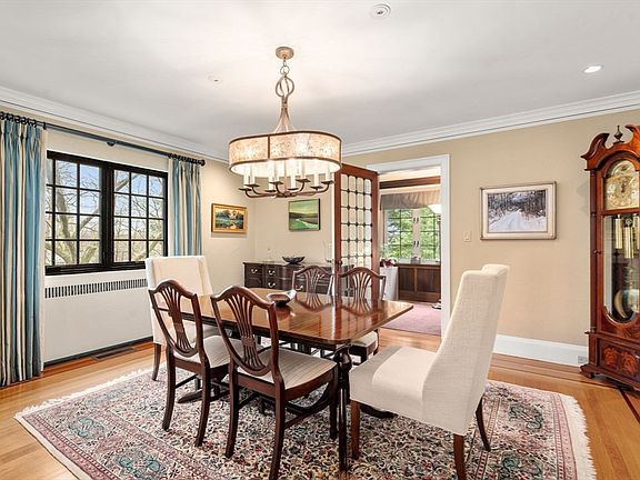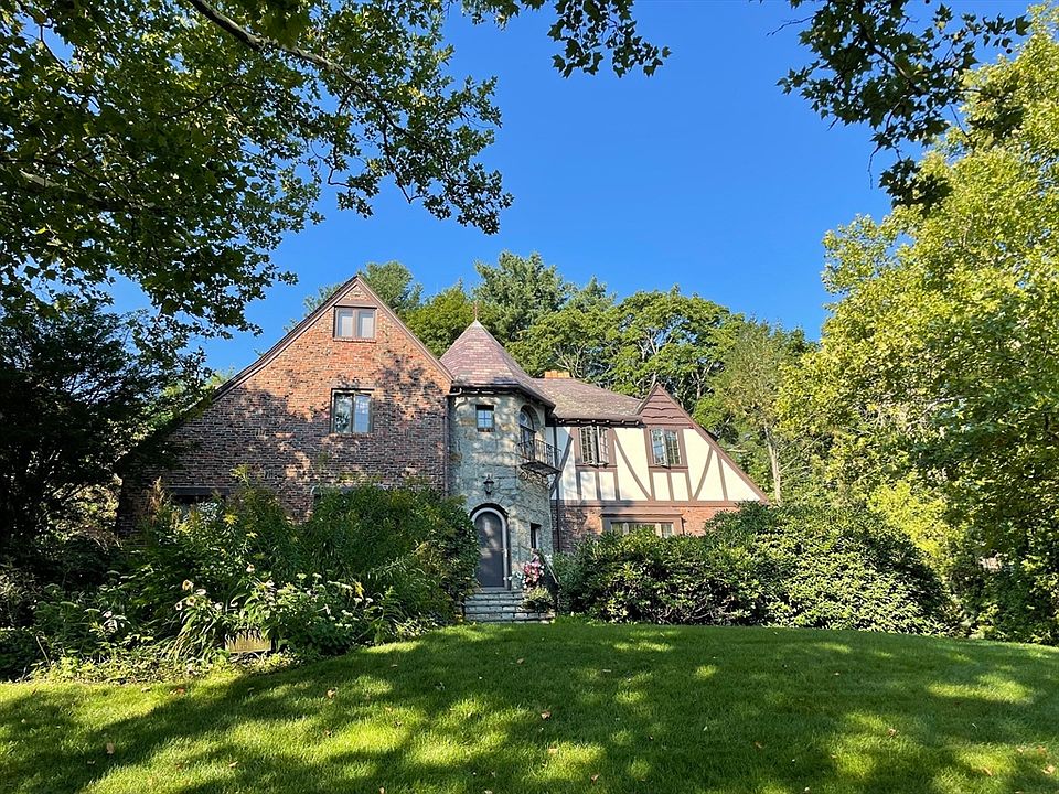Nestled atop a gentle knoll on a tree-lined street, this English Tudor offers timeless elegance with thoughtful updates. Located in the Baker School district and minutes from Chestnut Hill, this 5-bedroom, 5-bath home combines character with inviting living spaces. A sun-filled step-down living room with fireplace, a formal dining room, and oversized windows set the tone for gracious entertaining. Intricate crown moldings, inlaid hardwood floors, and soaring ceilings showcase the home’s craftsmanship. The 1st floor also includes a bright eat-in kitchen, family room, private office, & full bath. Upstairs, the primary suite features an ensuite bath and walk-in closet, joined by two bedrooms with balcony and a charming turret room. The 3rd floor adds two more bedrooms and full bath. The lower level includes a direct-entry 2-car garage, a versatile family room w/kitchenette, exercise room, full bath, and laundry. Outside, relax in a private, beautifully landscaped yard w/bluestone patio.
