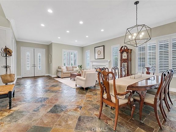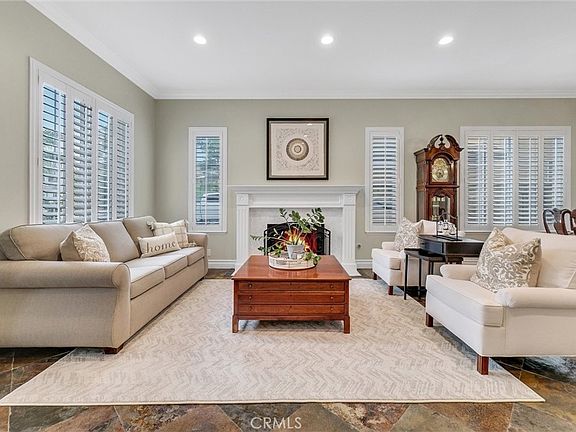 This beautifully remodeled home is located on a cul-de-sac in the highly sought after community of Canyon Crest Estates. Upon entering the home, you immediately notice the high ceilings, the unique slate floors, and the open floor plan. The craftsmanship of the woodwork throughout this beautiful property is exceptional. The recently upgraded kitchen features quartz countertops, white wood cabinets to the ceiling, a large island with a built-in wine rack, double ovens, and a walk-in pantry. The adjoining family room includes a stack stone fireplace, a built-in entertainment center and french doors that lead to the serene backyard. The downstairs bedroom with ensuite is perfect for guests and includes quartz countertops and a custom tub/shower enclosure. Upstairs there are 4 additional bedrooms, 2 recently updated bathrooms, and an extremely large bonus room, all with luxury wood vinyl flooring! The spacious primary bedroom has an ensuite featuring a spa like soaker tub, a standalone custom tile shower, a dual sink vanity with quartz countertops, and a huge walk-in closet. One of the upstairs bedrooms, currently used as an office, has hand crafted wood cabinetry and glass french doors. The additional upstairs bathroom has quartz countertops, dual sinks and a custom tub/shower enclosure. There are many windows in this light and bright home, all with plantation shutters. The private backyard provides an additional living space with a large custom covered patio that includes recessed lighting, a ceiling fan, and a mounted TV and speakers. The cascading water fountain, the built in rock fire pit and quality artificial grass are surrounded by lush foliage creating a perfect space to play and entertain. Beyond all of this, Canyon Crest offers a Guard Gated Community with many amenities, including a clubhouse, gym with locker rooms, tennis courts, sports courts, pools, a spa, and a park with picnic areas and a playground. You also have the coveted lake rights at Lake Mission Viejo which includes beaches, boating, swimming, fishing, concerts, movies, and special events for every age group! Come see this turnkey home and start living the Mission Viejo Lifestyle!