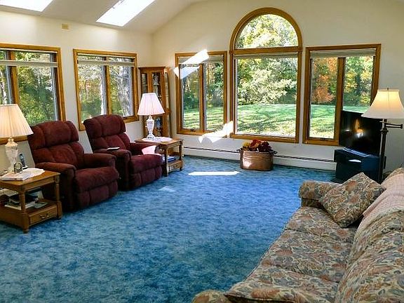This 7-room 3-bedroom and 2-bath Sterling-built updated brick-front ranch on 2.25 gorgeous open acres features an eat-in-kitchen with oak cabinets & a brick wood-burning fireplace; a large sunlit family room with skylights and three walls of windows; a finished heated basement; central air-conditioning, hot water baseboard heating and poured concrete foundation & steel I-beam construction. This Frelinghuysen home is located on a quiet road and is a convenient distance to Johnsonburg, Blairstown, Newton and Route 80.
