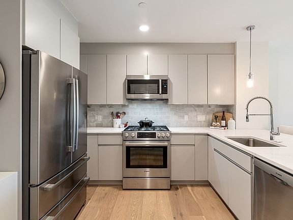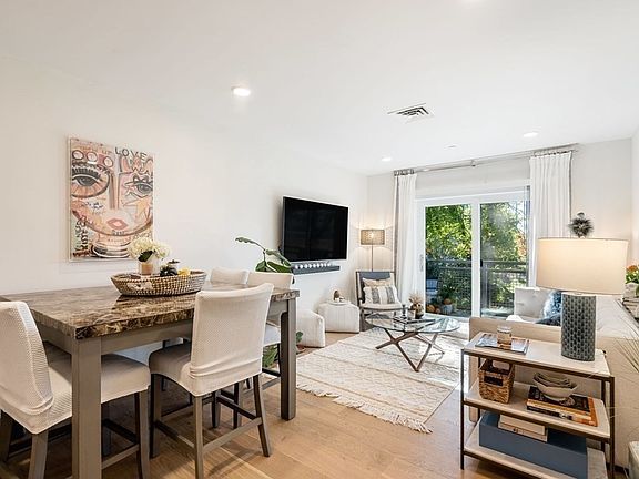 Completed in 2019 sunny 2 bed, 2 bath unit with heated GARAGE parking. Functional open plan kitchen/dining/living leads to a large private deck overlooking Noyes Park. Sleek cooks kitchen with stainless steel Bosch appliances, marble backsplash, quartz countertops, gas cooking, counter seating for 3-4 with ample storage including pantry closet. Oversized primary suite accommodates king bed/furnishings plus additional seating/Peleton/Hydrow/office area, an en-suite w/walk-in shower and walk-in closet. Generously sized 2nd bedroom fits queen bed and furnishings has a double wide closet and is across from hall bath with shower/tub combo. All this plus central air, wide plank floors throughout, radiant heated floors in bathrooms, in-unit laundry. Prof managed, elevator building w/ bike storage, pet washing station, common patio & a secure lobby for packages etc. Orient Heights T station, numerous neighborhood restaurants and access to Logan, 1A/93/90 just seconds from your front door.