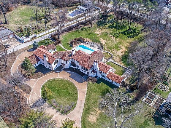 A picturesque example of a Maritz & Young home designed in the Spanish Colonial style w/ nearly 2 acres in Clayton's Brentmoor Park. Originally built in 1924, an addition nearly doubled the size of the house in 1935. White stucco walls and a red tile roof, scalloped lintels & corner octagonal tower greatly define the home's character. Updated by the current owners with geothermal system, newer kitchen and bathrooms, & renovated coach house while keeping in the tradition of the leading residential architectural team of that generation. Enjoy your summer evenings on the terrace overlooking the salt water pool w/ historic grotto. Placed at the end of a cul-de-sac privacy is guaranteed. A grand house for entertaining with circular drive. Formal entertaining areas are balanced with an informal family room and master suite retreat. 4-car garage. Become an important part of St. Louis' history as a caretaker of one of Clayton's most architecturally significant residences. 3D Tour available.