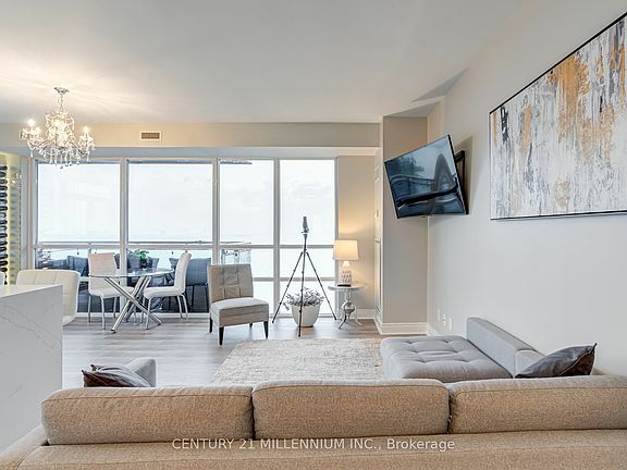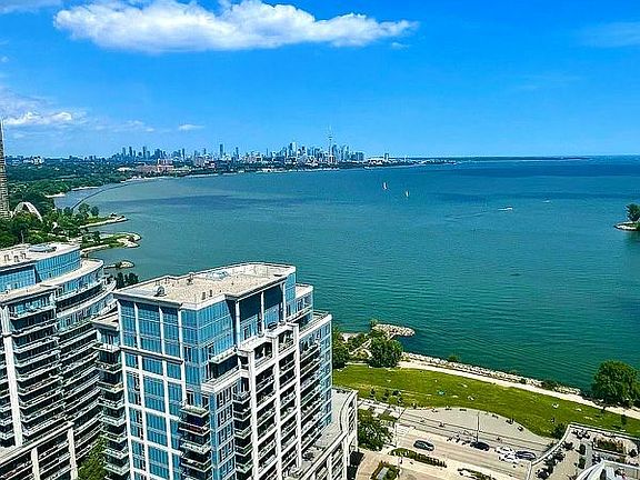 Prepare to be absolutely amazed by this spectacular 1,020 sq ft condo, offering breathtaking, unobstructed views of Lake Ontario and the dazzling city skyline! This property is a true gem, featuring modern design finishes, nine-foot ceilings, and spacious glass-railing balconies that showcase panoramic views of the beautiful shoreline. The kitchen is a showstopper with custom-designed sleek white appliances, gleaming gold finishes, and a massive granite waterfall island. Luxuriate in the open, airy living spaces with floor-to-ceiling windows and large balconies in both bedrooms, plus the convenience of in-suite laundry. The primary bedroom boasts a generous walk-in closet and a stylish 3-piece bathroom, while the second bedroom is perfectly situated across from a chic 4-piece bathroom. Enjoy top-notch amenities including a swimming pool, exercise facility, guest suites, and a common rooftop deck. Located just off the Gardiner Expressway, this prime spot offers seamless access to downtown Toronto and beyond. Nature enthusiasts will be thrilled by the close proximity to Humber Bay Shores Park, where an extensive network of scenic waterfront paths and trails awaits exploration. Picture yourself ending the day with a stunning sunset over the water, transitioning into a sparkling starry night skythis could be your new evening view! Do not miss out on this incredible opportunity!