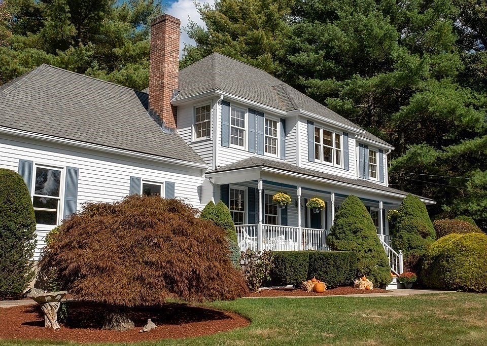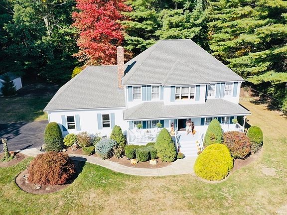 Come see this lovely 4 bedroom, 2 ½ bath colonial located in sought after Stoneybrook Estates. Relax on a farmer's porch overlooking an impressive, manicured .92 acre lot in a quiet cul-de-sac family neighborhood. As you walk through the foyer, you'll be impressed by the living room w/ fireplace that opens into the kitchen, a dining room w/ large picture window overlooking private back yard, & a sitting room. First floor also offers a 1/2 bath and laundry room. The second floor has a master suite w/ large walk-in closet, master bath w/ jacuzzi & walk-in shower. Three add'l large bedrooms and another large full bath complete the second floor. The newly finished basement is ideal as a guest room, office, school room, gym and/or entertainment. The house offers central air, 2-car heated garage, and easy access to 495 and commuter rail. Lastly, relax on the large patio deck in a private and tranquil backyard offering New England charm complete with many trees, bushes and gardens.