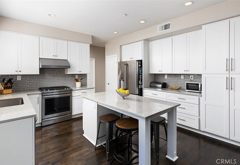 A stunning, crisply-remodeled first floor is the center jewel of this stunning Talega home. A modern front sitting room with tall ceiling sets the tone of the design. Walk into the formal dining area with a piano nook highlighted with chic wallpaper. The open family room-kitchen area is ideal for spending time at home: turn on the fireplace, pull out the games from the new built-in cabinetry, and gather for dinner around the updated quartzite kitchen island. You’ll love cooking here: Shaker cabinets, good storage, on-trend grey tile backsplash and an extended island with space for in-kitchen dining stools. A powder room and laundry room complete the downstairs. Walk up the front staircase and you’ll see the great layout that includes a very useful loft! Others have easily converted this bonus room into an additional bedroom. Two secondary bedrooms share a hallway bathroom with tub & shower. The spacious primary bedroom includes a bathroom suite, updated with large-format sleek tiles, white marbled granite, dual sinks & walk-in closet. An attached two-car garage was recently updated with epoxy flooring, cabinetry and new garage door. The backyard, accessed by the kitchen’s sliding doors, provides enough space for kids to play, dogs to roam and outdoor dining with an open-view of the neighborhood and mountains. Located in a PRIME location within Talega: walking distance to the massive Talega park with its playgrounds & walking trails! As a Talega homeowner, you’ll have access to the well-planned HOA events throughout the year, the many resort-style pools, sports courts, playgrounds & more. Talega boasts award-winning Vista Del Mar schools, a lovely village center and easy access to our adorable downtown San Clemente with its shops, restaurants and world-famous beaches. San Clemente is ideally located between LA and San Diego counties. Lower Mello Roos taxes in this section of Talega, too! Welcome to Calle Boveda, you’re going to love it here!