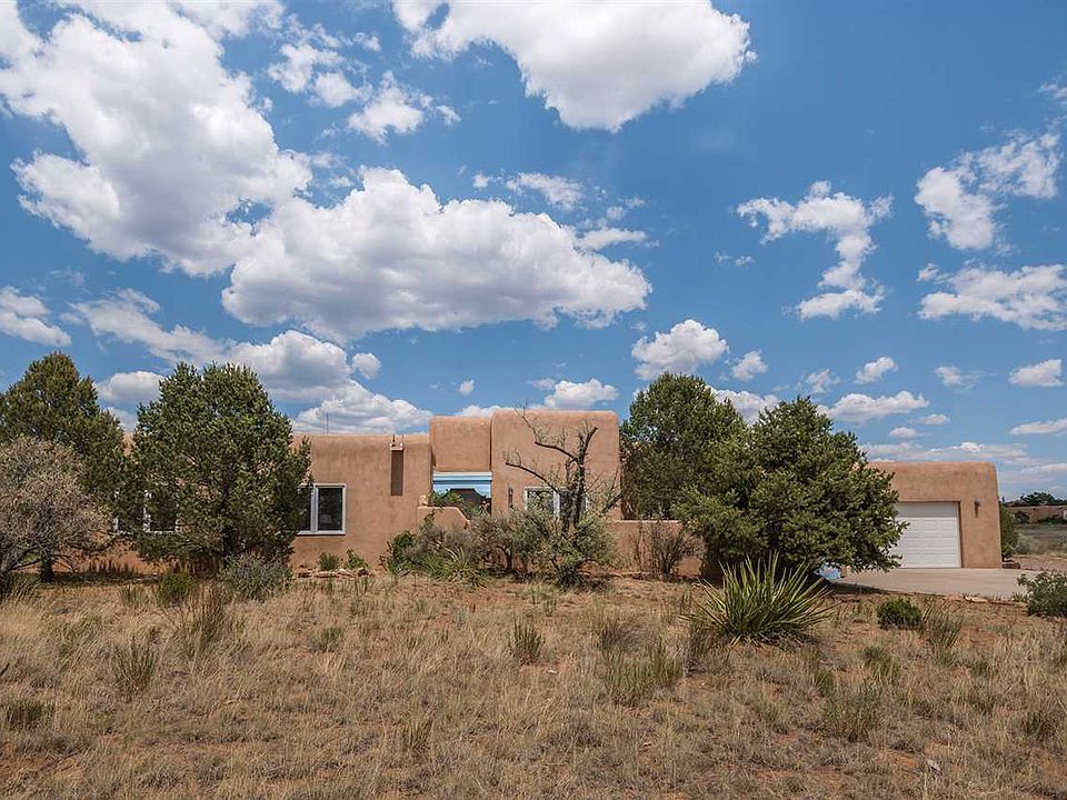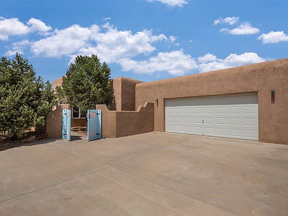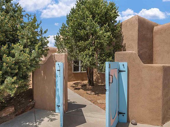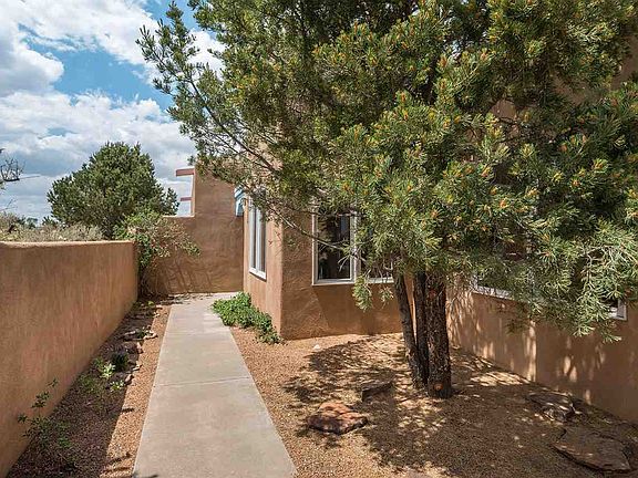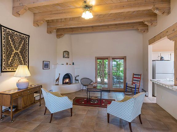 A soft contemporary before contemporaries were "cool". This lovely all one level home with open kitchen, dining room and living room with kiva fireplace. 3 bedrooms/2 baths, large closets. Master bedroom also has a kiva fireplace, large shower + tub and walk in closet. The outside portal runs the length of the house and creates an indoor/outdoor garden. Walled front courtyard, 2 car attached garage and paved roads for easy access.
