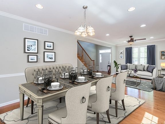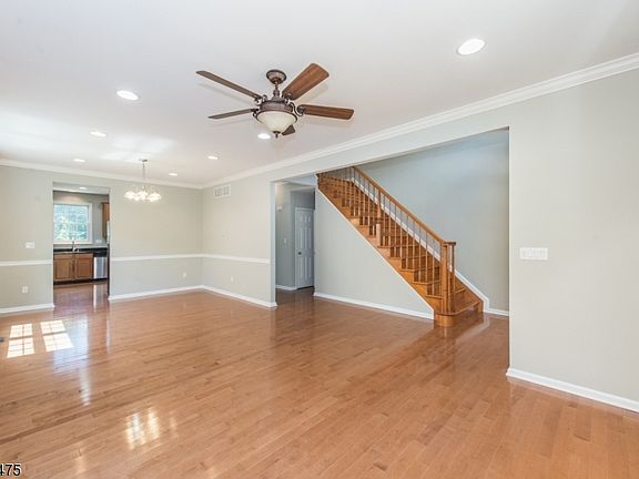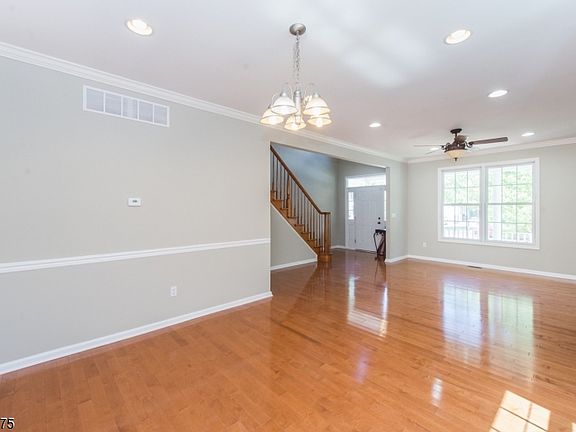 Cul de sac location, open floor plan, soaring ceilings, hardwood floors, walk-out finished basement are just some of the highlights! So much usable space - living room/dining room entertaining space, kitchen and large breakfast area open to family room, with sliders to newly stained deck which overlooks large yard and line of trees for privacy in rear. Family room is 2 story with recessed lighting and gas fireplace and has access to laundry and 2 car garage. 2nd floor offers 3 spacious bedrooms plus master suite with sitting area and full bath with double vanity, jetted tub and stall shower. Full, finished walk-out daylight basement has full bath. Minutes to Rt. 80, dining, shopping and NJ transit train. Great community with great schools!