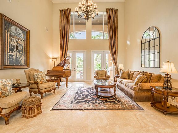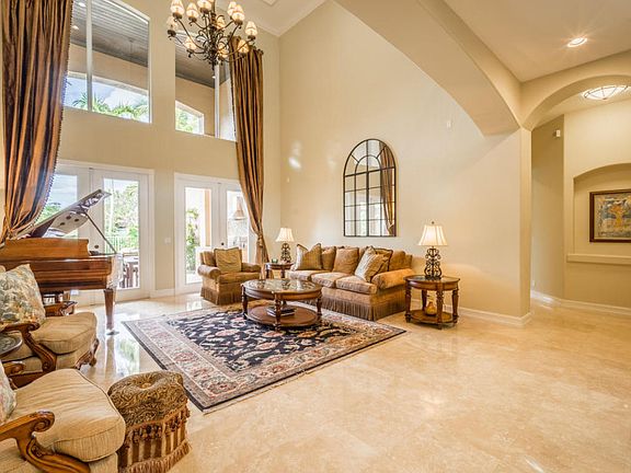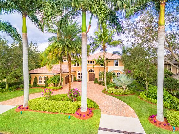 Spectacular golf estate impeccably maintained with million dollar golf course views and lush tropical landscaping overlooking the patio/pool/spa and out to the 14th fairway of the Squire golf course in the Burwick Estates subdivision of PGA National. This 5 bedroom plus den, 61/2 bath estate home with a 3-car garage built in 2004 has over 5,000 square feet of luxurious living space. The downstairs master bedroom features His & Hers baths with walk-in closets and beautiful golf course views. There is also a guest bedroom and office downstairs. This turnkey residence is in move-in ready condition with many custom features like the Chicago brick paver driveway, entry fountain, 500+ bottle climate-controlled wine cellar, volume ceilings, 40kw generator, covered patio with cypress wood ceiling...