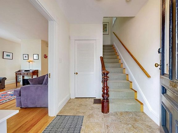 Just steps from Davis Sq. but nestled at the end of a cul-de-sac, this attractive, renovated single family has C/A, landscaped yard, deck, patio, driveway, and garage with EV charger. To the left of the foyer, a French door opens to a bright LR w/wood floors and bay windows and door to half bath. A partition defines the separate DR, directly across from the spacious kitchen w/cherry cabinets, light stone counters, tiled backsplash, ss vent hood, gas range, microwave, dw, and bow windows overlooking lush gardens. Beyond the DR is a studio/laundry/mudroom/pantry with door to the deck and lovely yard. Upstairs, the primary suite features a bedroom with vaulted ceiling, spa bath, and lg walk-in closet (which could be converted to another bedroom). A second bedroom and full bath lie at the other end of the hall. The top floor has 2 bedrooms/offices. The unfinished bsmt has ample room for workout and workshop equipment as well as systems and storage.