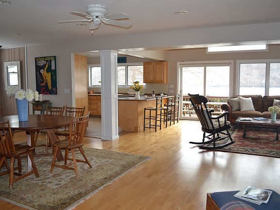 WESTERN EXPOSURE level yard, sandy beach and deep water dock. This Colonial 200 SF, 4 bedrooms, 2 full bathes. This waterfront home offers an open floor flowing floor plan and beautiful lake views. The updated kitchen opens to the great room with warm fireplace Entertaining is easy in the large dining room. The cozy den and laundry room complete the main level. The upper level has 4 bedrooms. Relax on the large deck and enjoy the long views and beautiful sunset. $595,000