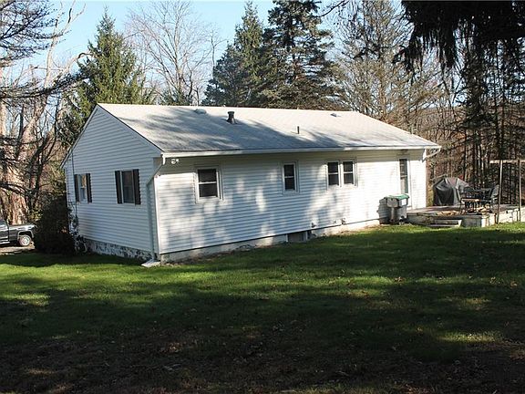 Adorable ranch located on a quiet, private road. Eat in kitchen with stainless steel appliances with walkout to flagstone patio for easy entertaining. Hardwood floors flow freely through cozy living room with large picture window overlooking serene property. Master bedroom and second bedroom both with double closets and beautiful hardwood floors. Full bath with marble counter and tile bath has been tastefully updated. Additional office/den just off the kitchen for added space. Basement has been waterproofed and is very neat and clean with easy access to one car garage. Central monitoring alarm system & water softener. Park like property surrounded by wooded land and seasonal mountain views! Homeowner has lovingly taken care of this beautiful ranch home.