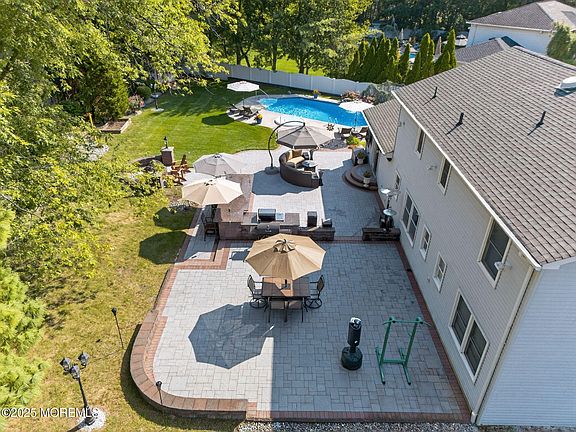 THIS HOME'S BACKYARD AND OVERALL CONDITION ARE OUTSTANDING! Beautifully maintained and spacious 5-bedroom, 2.5-bath colonial in pristine condition on nearly half acre! Tucked away as ''the crown jewel'' of a cul-de-sac, this home showcases a resort-style backyard with an inground pool, waterfall, spa/hot tub, pavers and custom outdoor grill—perfect for entertaining or unwinding in total privacy. Upgraded kitchen shines with maple cabinetry & granite counters, opening to a vaulted family room with skylight. The first-floor bedroom ideal for guests or a home office. Elegant formal living and dining rooms feature charming bay windows. The expansive owner's suite offers a luxury renovated bath, enormous walk-in closet and generously sized bdrms throughout. Gleaming wood floors on every level!
