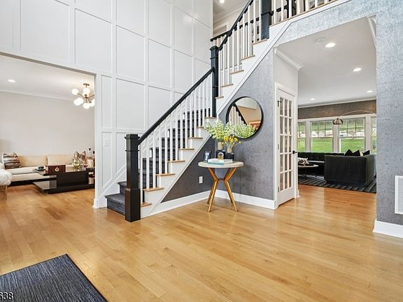 Beautifully renovated and professionally designed in 2020, this light filled 5-bedroom, 5.1-bath Center Hall Colonial is a true showstopper! A dramatic two-story foyer sets the tone for the sophisticated interiors, featuring a formal living room, a den/home office, and dining room with wet bar. The spacious family room with gas fireplace flows seamlessly into the gourmet kitchen, complete with large center island, stainless steel appliances, a walk-in pantry, and a breakfast area with sliders to the patio and backyard. A first-floor bedroom with en-suite bath offers the perfect retreat for guests. Upstairs, the luxurious primary suite is a private sanctuary, showcasing a spa-like bath with deep soaking tub, oversized shower, and dual fitted walk-in closets. Three additional bedrooms with 2 full baths along with a convenient laundry room, complete the second floor. The finished lower level extends the living space with a large recreation room, exercise area, full bath, and mudroom with direct access to the 2-car garage, equipped with a Tesla charger. Step outside to discover a backyard oasis designed for both entertaining and everyday enjoyment. The fully fenced grounds feature an expansive patio with outdoor television, lush privacy landscaping and sports court!