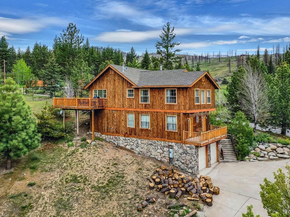 Beautiful home inside and out with amazing views all around! Sit on the expansive deck and enjoy the scenery! With three levels, the main living is on the top floor. It is a very spacious, open area with many windows. Included on the top floor is the kitchen, dining and living room with an open concept, half bathroom, and large master bedroom and bathroom. There is also a freestanding woodstove with floor to ceiling rock hearth. The middle floor has three bedrooms and two bathrooms - one with a jacuzzi tub, a laundry room, and an extra, small room wired with 220 for a possible sauna. Many closets and storage throughout. The bottom floor is a large two car garage. The outside beautiful cedar siding, railings and trim all have been recently re-stained. In the heart of Markleeville, this home is within walking distance to local restaurants, small grocery store, library, Markleeville Creek, and more.