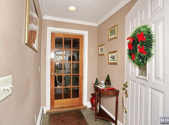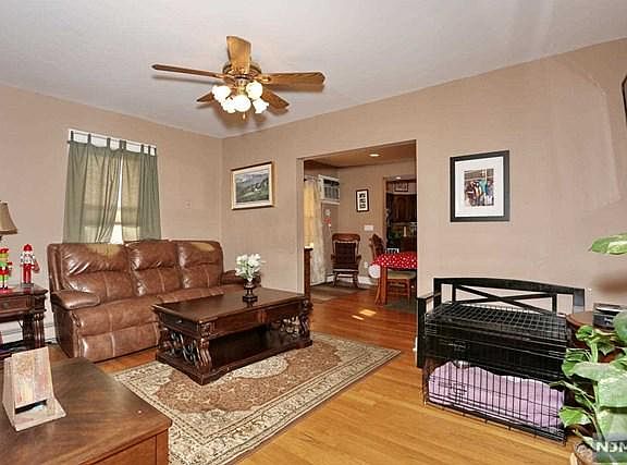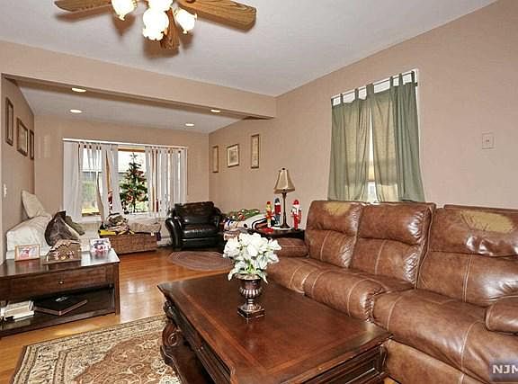 Entry foyer, large expanded living room, formal dining room, modern kitchen with island peninsula and dishwasher. Kitchen sliding glass door leads to large deck, nice paver patio and beautiful fenced yard. Two 1st floor bedrooms & newer full bath. Upstairs, master bedroom suite with new master bath and plenty of closet space. 2nd upstairs bedroom has a separate office/nursery, 3rd bedroom is good size. Basement is nicely finished with family room, convenient 1/2 bath, laundry. Gas hot water baseboard heat. Garage. Great location on quiet street close to NY transportation and local shopping.
