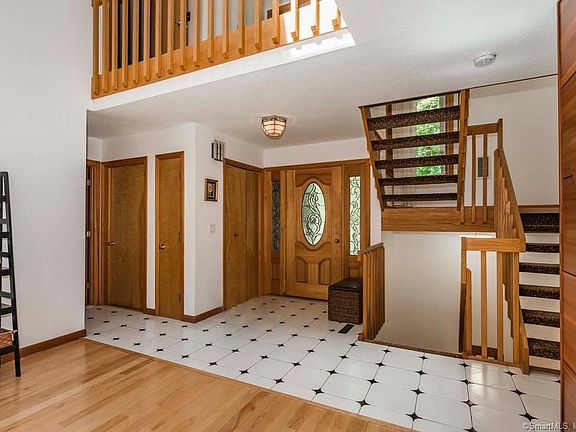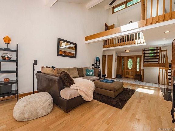 Enter into this classy contemporary home with custom features!The gracious foyer into the living room has bright expansive cathedral ceilings showcasing the windows & setting outside wonderfully.The 2-sided fireplace is a show piece to be enjoyed into kitchen too, w/ Sapele wood over fireplace & kitchen island shelf.This open flpn home has large kitchen with window seat, granite, stainless appliances, island, eat-in area & sliders to 2-story solarium for enjoying plus the upper deck from master bedroom.More space is offered with the large mudroom, pantry area, half bath & laundry room with side door. Large dining room has sliders with a deck for enjoying outdoor entertaining.Also on 1st fl are 2beds & remodeled full bath.Floating stairs lead to the 2nd fl with sitting area.The master bed & bath are custom with cathedral ceilings in both, slider to solarium and remodeled bathroom with outstanding shower, tile, seamless glass doors and double sink area, huge walk-in closet.The 4th bd at 2nd floor has new windows, built-ins & wrap around large closet.Outside great for entertaining on large deck, koi pond, gardens.New features include: roof & skylights, high efficiency double furnaces, white oak floors, security system, insulated garage doors, much more.Electronic Vehicle Charger in the garage.Located in quiet cul-de-sac, close to Cheshire line & highways, 50+ landtrust acreage in rear- so much to enjoy for those seeking simple lifestyle in this beautiful pride of ownership home!