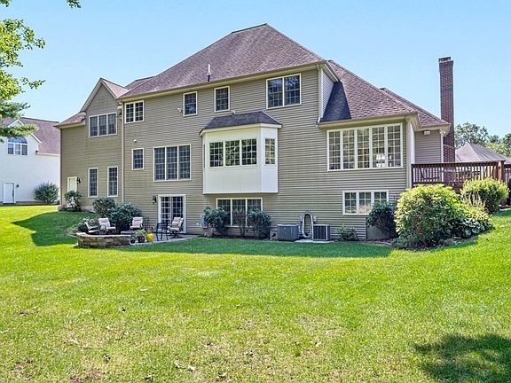 Spacious custom Colonial abutting Norton Country Clubs 2nd tee!.  Upon entering into the double stairway Foyer you immediately sense calm.  The formal dining room offers hdwd floors with inlay design, wainscoting and tray ceiling.  The Kitchen offers new flooring, granite counter tops, center cooktop with downdraft, subzero refrigerator, double wall ovens, walk in pantry and a roomy eat in area.  The Kitchen leads to a formal Living Room with decorative columns, sip coffee in your heated sunroom with french doors that lead to the cathedral ceiling Family Room with gas fireplace.  The 2nd floor offers 3 large Bedrooms plus a Main Suite with vaulted ceilings and sitting area.  The Main Bath offers Jacuzzi tub, double sinks, granite counter tops and separate shower.  The 2nd floor full bath offers double sinks as well.  The laundry is also on the 2nd floor.  There is also a space above the foyer which is currently being used as a double WFH space.  The walk out Basement is fully finished