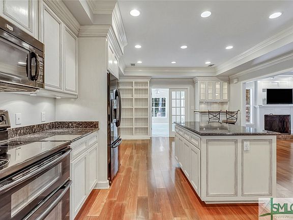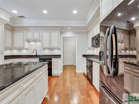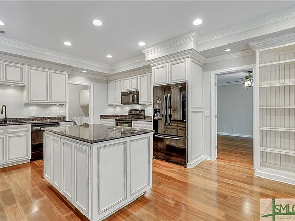 Looking for a private neighborhood with a dock and ocean water access? This 3 bed 2 bath cul-de-sac home is located in the perfect gated waterfront neighborhood, offering a dock, boat ramp, boat and rv storage, and resort style amenities. This home offers a split floorplan, featuring a formal dining room, spacious living room with wood burning fireplace and coffered ceilings, and off kitchen sun room. The gorgeous kitchen boasts double ovens, large island, granite countertops, and custom cabinets with more than enough space for all your kitchen essentials and another beautiful coffered ceiling! The primary suite is complete with his and her closets, double vanities, and a spa like walk in shower. Additional features include all brick exterior, open floorplan, back up to woods for added privacy, and additional lighting add ins in kitchen. Neighborhood also features pool, tennis & playground. Located near I-95, Georgia Southern, Hunter Army Airfield, and so much more. 3D tour available.